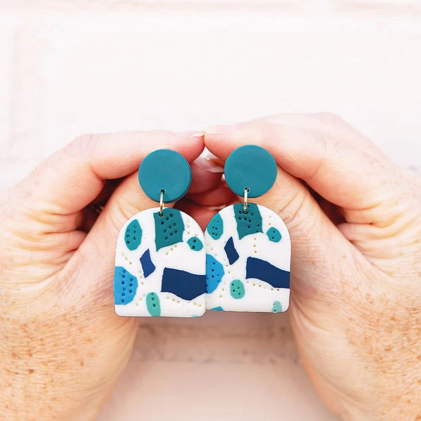 These abstract blue Clay Earrings are sure to make a statement when added to any outfit! A pair of statement earrings will be sure to have you stand out in the best way! Pair these earrings with a monogrammed top and your go-to denim or your favorite pair of monogrammed boots for a fun look!