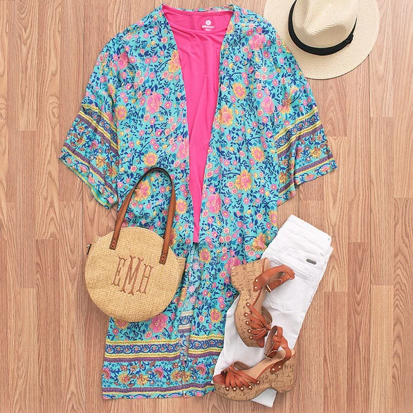 Our floral print duster is the perfect for dressing up any look. In addition to its exclusive floral print, this duster features lovely movement that catches the breeze beautifully. It transforms an ordinary outfit into something bright and beautiful. An open front, relaxed sleeves, and a long, flowing style speak to a casual, comfortable look that is great for a layering. Pair with a cute solid-color top and skinny jeans, or a monogrammed T-shirt dress, and your favorite monogrammed sandals.