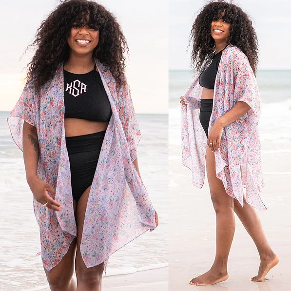 This sheer, breezy floral print kimono features a flowing style and a sweet floral pattern that is a perfect addition to your wardrobe. Whether you pair this open-front kimono with a dress, a jumpsuit, black leggings and a solid T-shirt or your favorite Marleylilly monogrammed swimsuit, you just can’t go wrong with this fun fashion-forward piece.