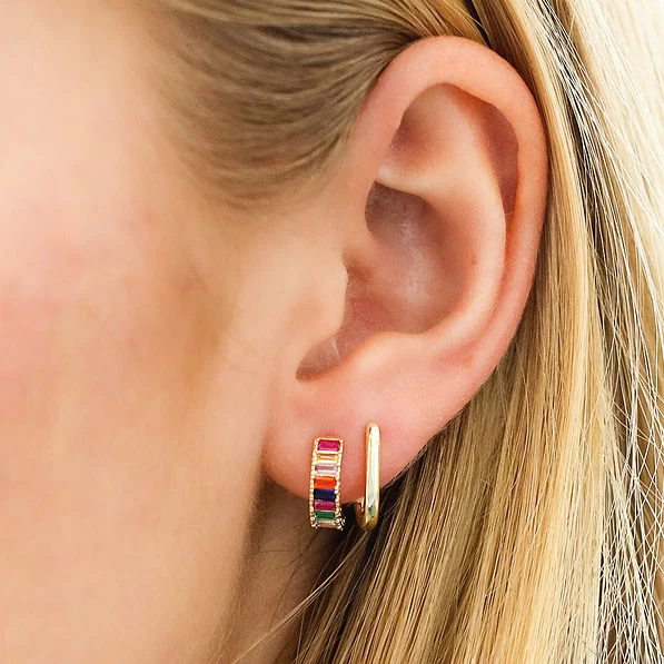 Trendy and classic, these delicate huggie hoop earrings are a must have for your jewelry box! Matching perfectly with all basic colors, these earrings feature multi-color baguette shaped gemstones with a hinge closure for the perfect everyday look. Pair with a monogrammed top and monogrammed sandals for the perfect look!