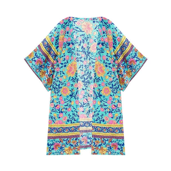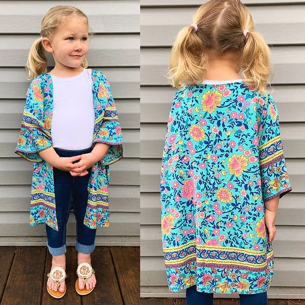 Your little girl will LOVE this comfy floral kimono for spring and summer! Pair it with her favorite tank & jeans or use it as a swim cover up! This open-front duster is so comfortable and features an adorable pink, yellow, navy, and turquoise flower design.