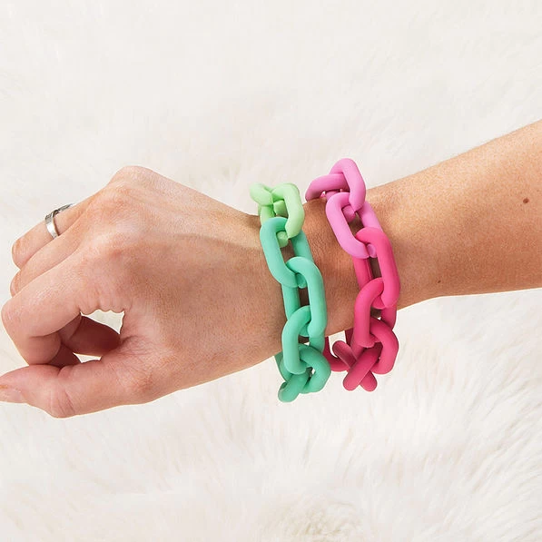 Dress up your look with this vibrant Monogrammed Acrylic Link Bracelet! Your monogram is engraved on a 0.7 inch disc. Available in Pink or Mint, this bracelet would look cute with any spring or summer outfit and could be paired with a monogrammed necklace and earrings! Personalize one to add to your jewelry box today!