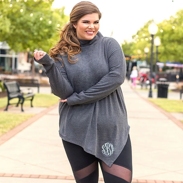 Stay warm and cozy in style all season long in a Monogrammed Asymmetrical Turtleneck Tunic from Marleylilly. Toss one over skinny jeans or leggings and a pair of monogrammed duck boots, and you’re ready for anything. Whether you’re tailgating for your favorite team, enjoying a brisk hike or running errands in town, this flattering tunic has you covered with cozy thumb holes, drop-shoulder seams and a soft turtleneck collar.