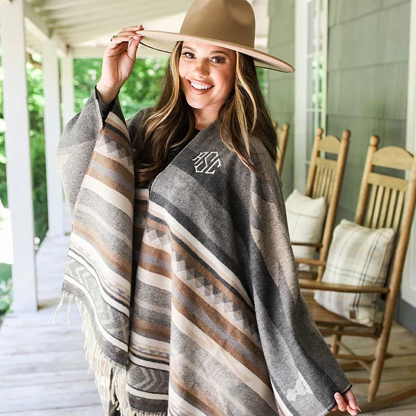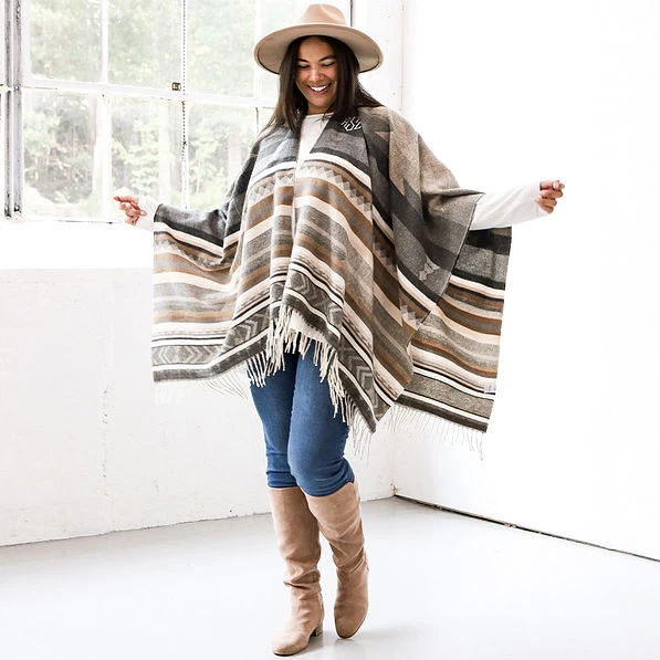 Keep warm this season in our trendy aztec poncho! These cozy aztec ponchos feature fringe along the bottom hem and an open front perfect for versatile layering. Made with a acrylic material, this poncho creates a trendy look that’s easy to mix and match with your basic monogrammed tops and monogrammed boots. It is a one size fits most style and looks great paired with our Monogrammed Tunic Shirt!