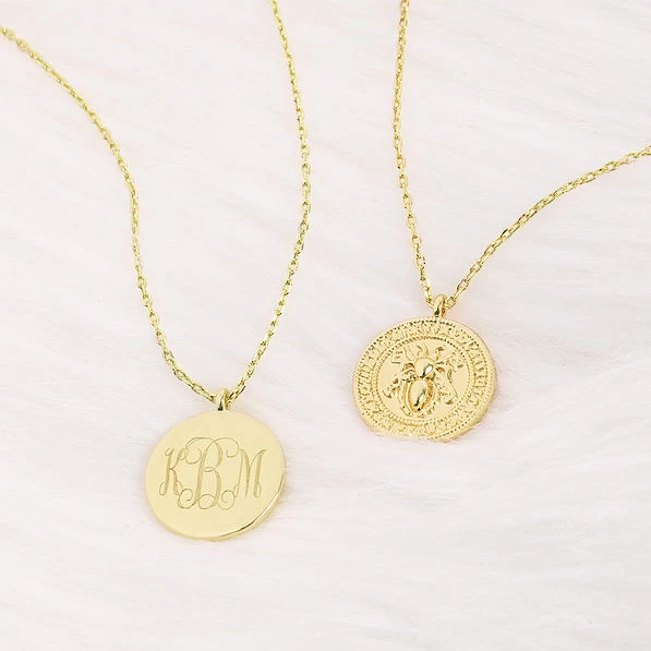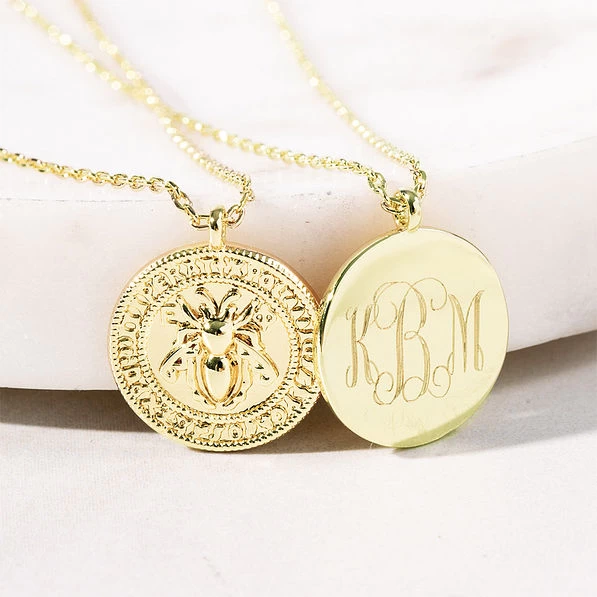 Calling all bee lovers, this necklace is as sweet as honey! Featuring a disc with a bee emblem on the front and your custom monogram on the other side, this necklace is truly versatile and perfect for everyday wear. This personalized necklace also makes a great gift for a birthday, special occasion, or graduation gift!