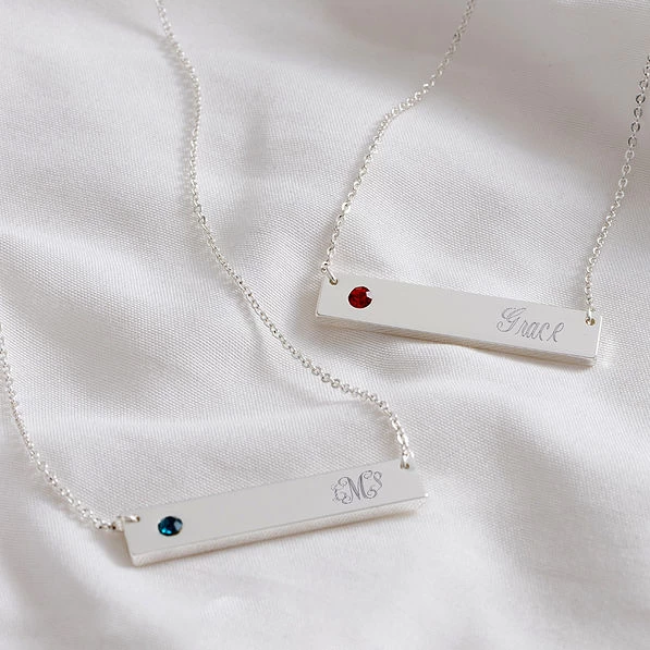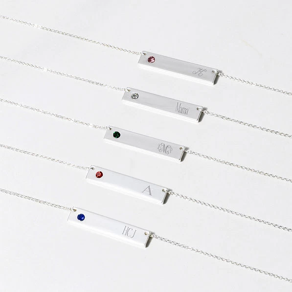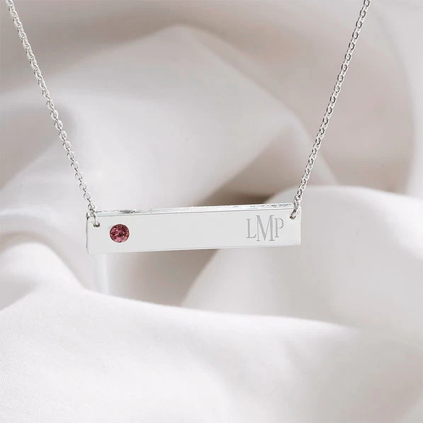 Choose from several different monogram styles — go with a traditional monogram or opt for your initials. We’ll engrave your choice on the left-hand side. If you’re looking for bridesmaids gifts, presents for your sorority sisters or a lovely gift for any jewelry-loving woman in your life, look no further! Our monogram birthstone bar necklace paired with a monogrammed bracelet is the perfect choice and will make her feel super-special. This necklace is also available in a non-personalized option.