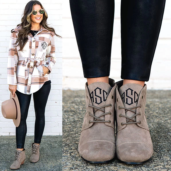 Complete your fall style with our Monogrammed Wedge Booties! Available in two colors, this bootie features a lace up front and around-the-clock comfort! Pair these cute booties with some jeans, a monogrammed sweater and some monogrammed jewelry!