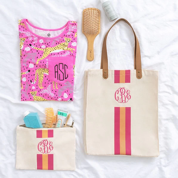 Keep up with your small necessities when traveling with this personalized pouch! This monogrammed canvas pouch is available in a variety of fun color stripes printed in the center. This pouch tosses perfectly into any Monogrammed Tote, Monogrammed Backpack , or Personalized Canvas Bag!