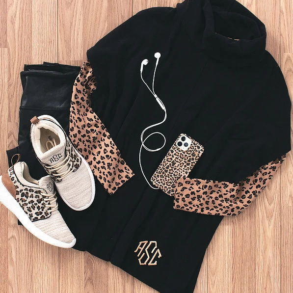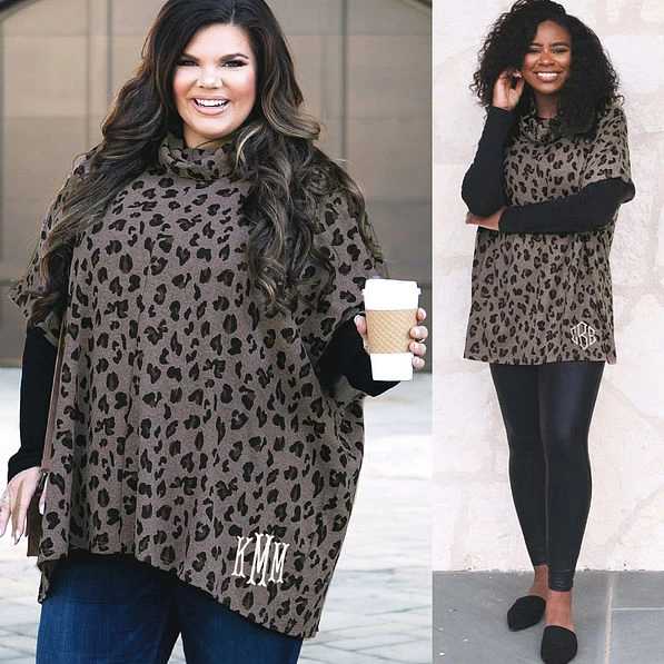 Stay trendy and stylish this season in this Monogrammed Cowl Neck Poncho! Available in leopard, black and gray, this short sleeved poncho features a flowy silhouette with a cowl neckline. This super soft poncho is perfect for wearing with leggings and a monogrammed tunic shirt!