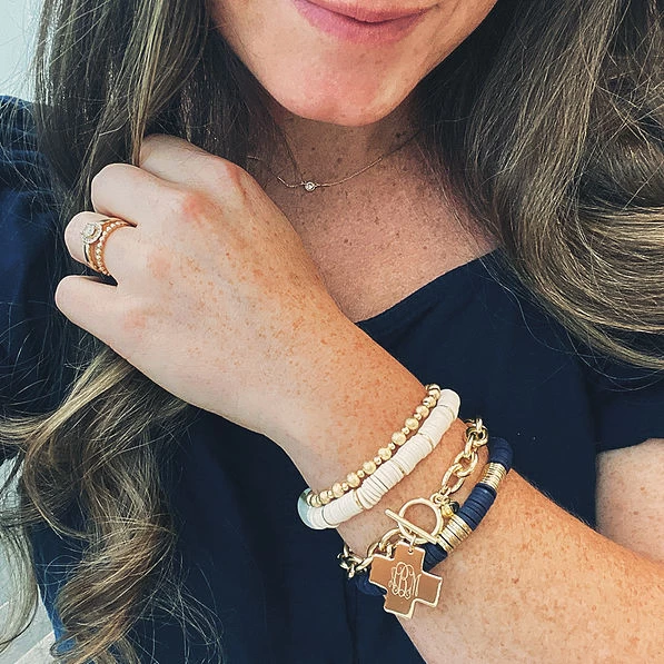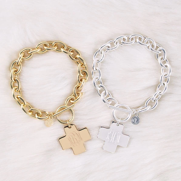 Dress up your look with this beautiful Monogrammed Cross Pendant Bracelet! This bracelet measures approximately 7 inches long. Your monogram is engraved on a cross pendant. Available in gold or silver, this bracelet would look great paired with our monogrammed cross pendant necklace! Personalize one to add to your jewelry box today!