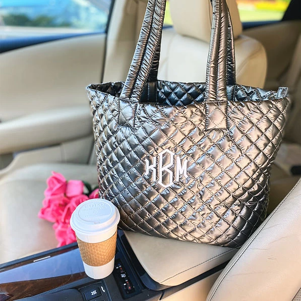 This Monogrammed Quilted Tote will be perfect for all of your adventures and is an everyday essential! With a diamond quilted design available in hot pink, black, hickory, metallic silver or red, this bag is perfectly roomy for all of your on-the-go necessities! This bag has a 9-inch drop handle making it easy to carry or throw over your shoulder!