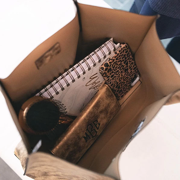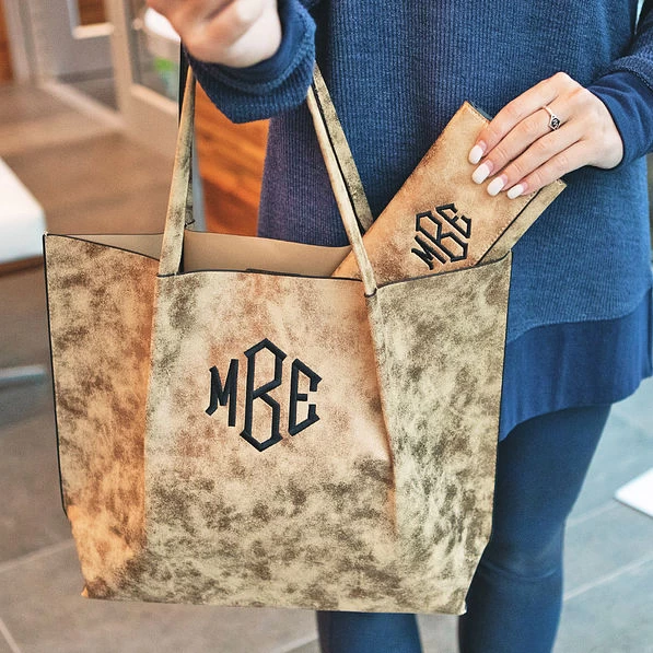 This metallic tote are perfect for fall. Our tote is made of faux leather with Antique Gold hardware. Easy-to-carry drop handles measure approximately 8 inches and make it perfect to throw over your shoulder and go. Fill with your choice of monogrammed goodies, including monogrammed wallets, monogrammed keychains and monogrammed phone cases.