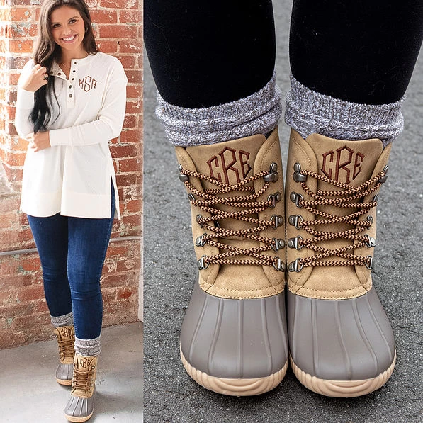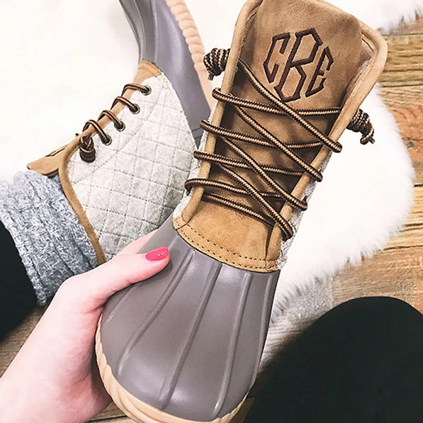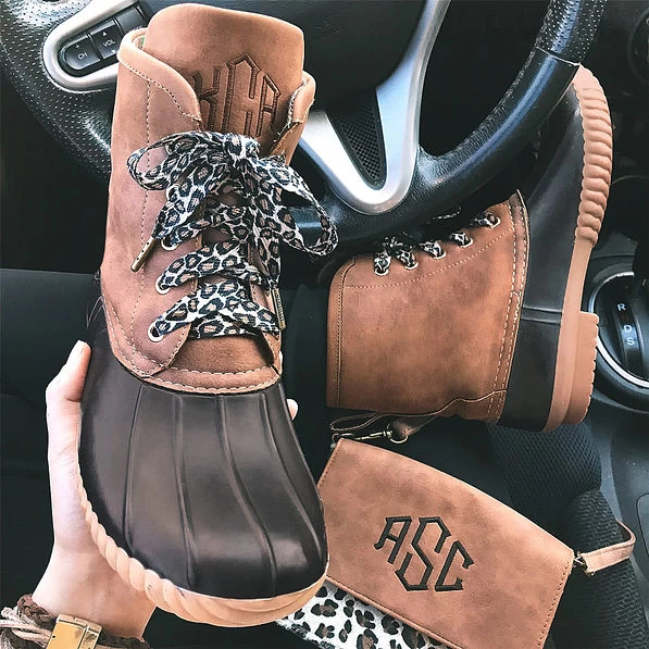 Enjoy the outdoors in style with our embroidered monogrammed duck boots. Choose from a wide selection of unique patterns and add-on accessories, or opt for a one-of-a-kind embroidered monogram. Buy your personalized duck boots today!