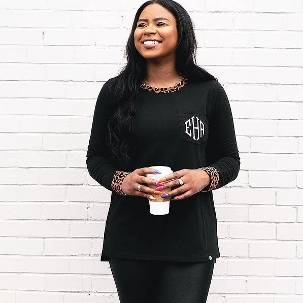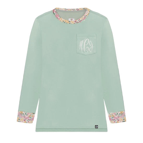 This Monogrammed Pattern Trim Sweatshirt will be your new favorite piece in your closet this fall. This trendy crewneck sweatshirt features a personalized faux pocket, side slits at the hem, and a pattern accent design on the collar and sleeves.