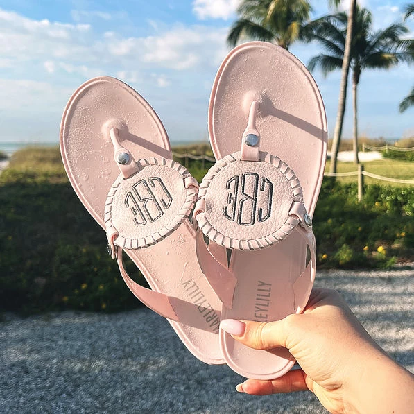 At Marleylilly, we’re ready for some fashion-forward summer style. This includes our super-popular Monogrammed flip flops. These slip-on-and-go monogrammed faux leather disc flip flops add instant style to your favorite summer jumpsuits, monogrammed dresses or our must-have monogrammed high-neck tank tops. Show off your fresh pedi with our stylish monogrammed flip flops.