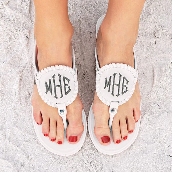 Choose your monogrammed script — we have intricate monogram script styles, block letter styles, fishtail, interlocking, and funky monogram scripts. You can also pick your favorite color from neutrals to vibrant jewel tones for your monogram flip flop color. The options are virtually endless.
