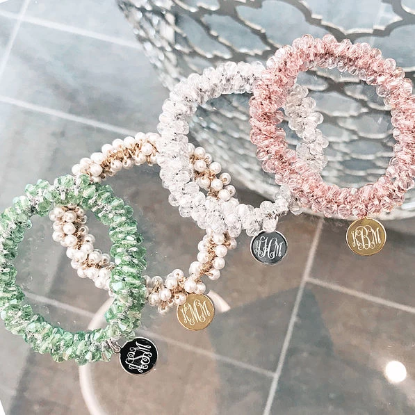 At Marleylilly, we love it when an item performs double-duty, which is why we adore this charming Monogrammed Beaded Hair Tie! This versatile elastic hair tie looks great when added to a messy bun, a top knot or an easy-breezy pony. It also can be slipped onto your wrist as a stylish bracelet. This personalized hair tie features cut glass beading that catches the light with its metallic, sparkling finish. Each tie also features an engraved 12mm disc charm that can be personalized with a monogram style and design. Discs are available in both silver or gold tones, depending on which bead color you choose.