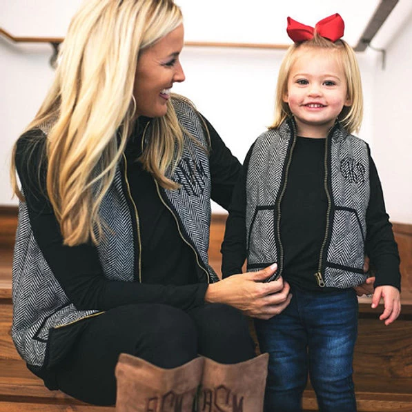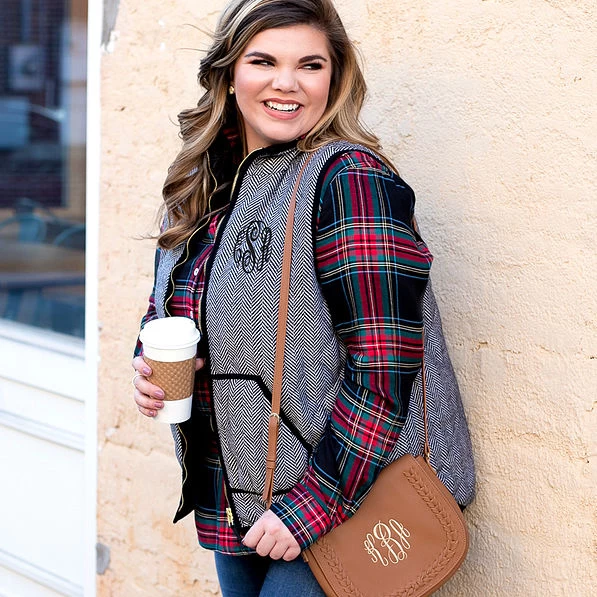 Complete your fall wardrobe with this stylish and comfortable Monogrammed Herringbone Vest! Perfect for layering over your favorite long sleeve shirt, this vest features a woven herringbone pattern and fashionable gold zipper! Similar to our puffy vest, this vest is comfy and cute. This vest also has two front pockets and is lined.