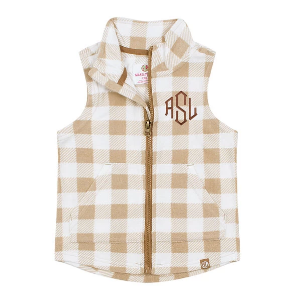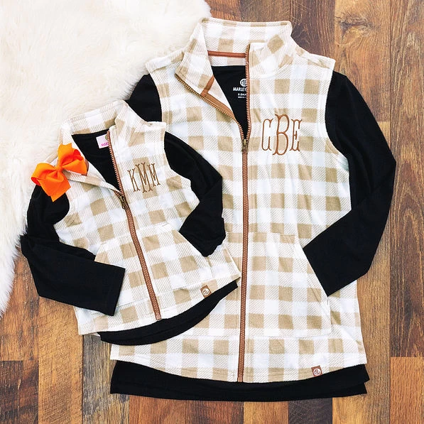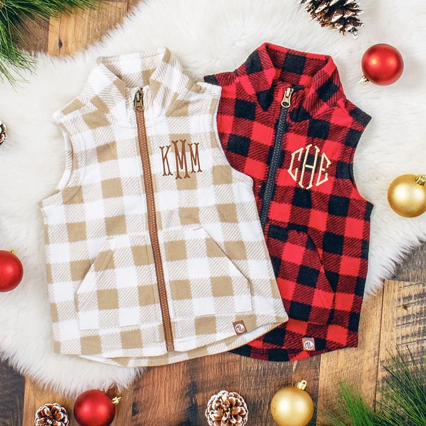Complete your kid’s fall wardrobe with this stylish and cozy buffalo plaid vest! Perfect for layering over your favorite long sleeve shirt, this super-soft fleece vest is a cozy and warm layering option! Pair this vest with a pair of Monogrammed Duck Boots for total warmth!