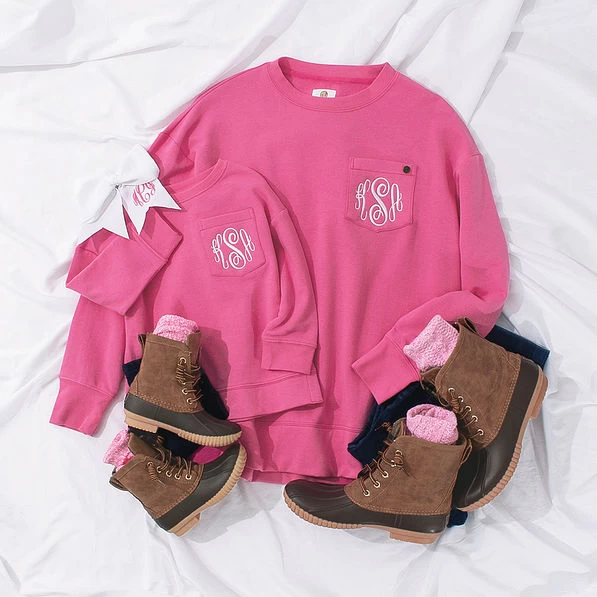 Love the Mommy and Me style? This monogrammed pullover sweatshirt is also available in adult sizes!