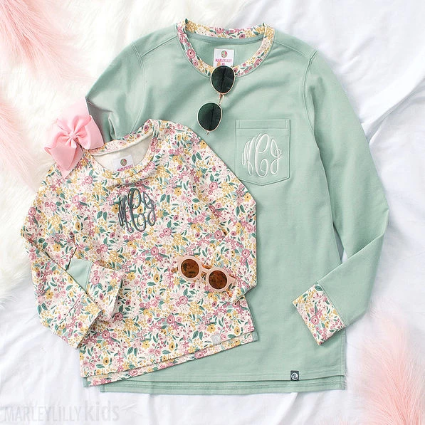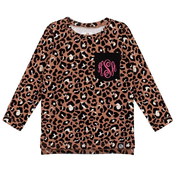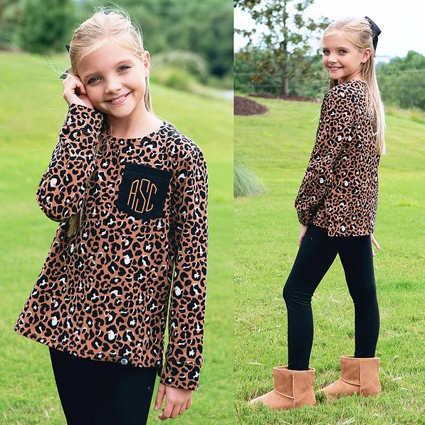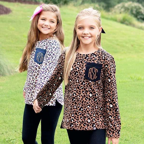 Your little girl is going to love these darling printed sweatshirts! Available in Navy Leopard, Fall Botanical, and Cheetah, these monogrammed girls’ sweatshirts are perfect for cooler weather! This long-sleeved top features a all-over print, side slits, and your child’s monogram on the front.