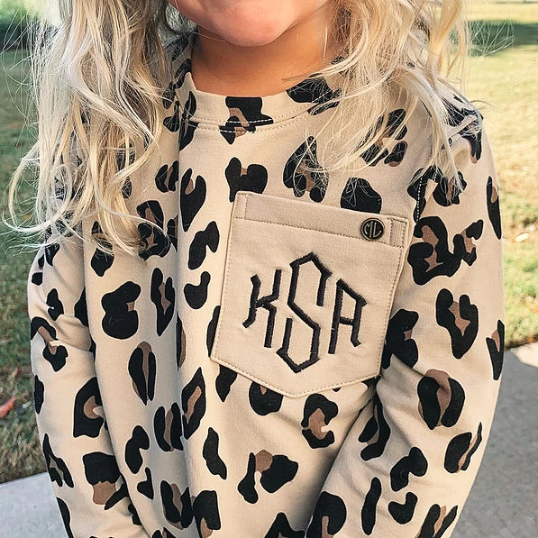 This monogrammed leopard sweatshirt is sure to let your little show her wild side! This long sleeve sweatshirt features a leopard print fabric, side slits, and monogrammed front non-functional pocket. It is so easy to layer with a vest and Duck Boots! This sweatshirt makes the perfect gift for the holidays!