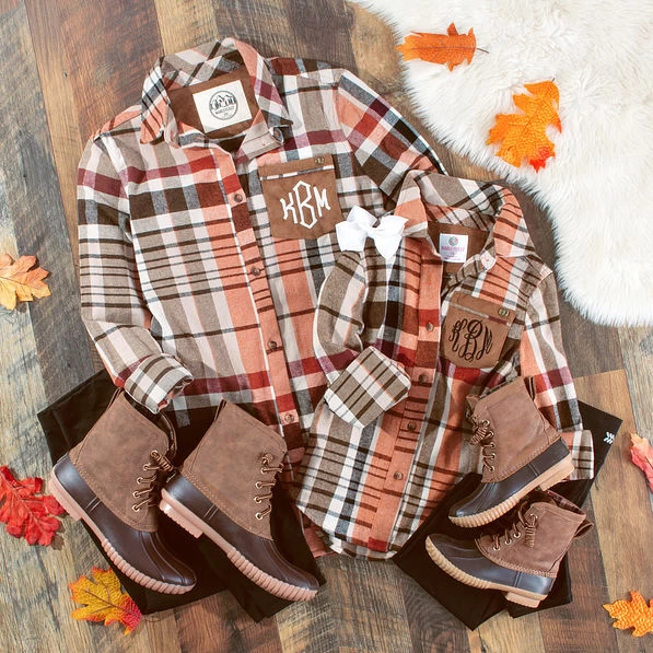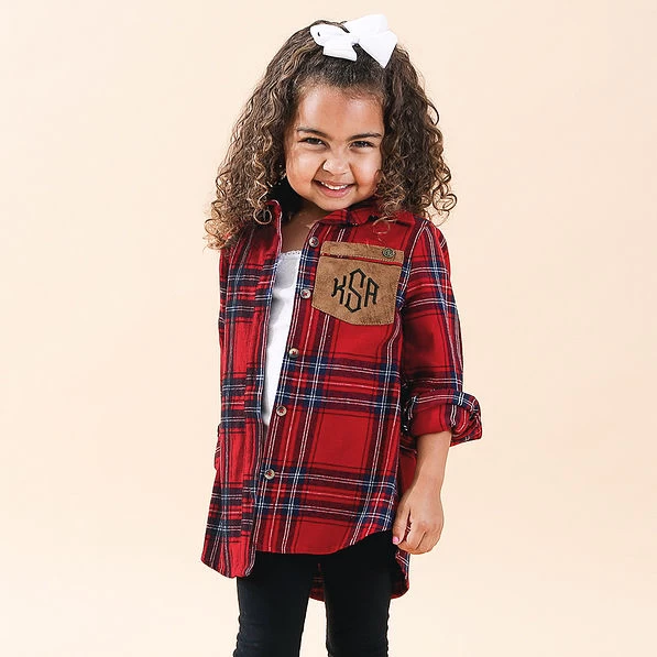 These personalized plaid button-down collared tunics feature a sueded, non-functional pocket with an antique gold “ML” Marleylilly logo plate. Its generous length allows your child to be comfy in its relaxed style. This Marleylilly tunic is great for layering — add your fave Marleylilly vest or jacket when extra warmth is needed. This unisex monogrammed plaid tunic is available in both toddler and youth sizes as well as adult sizes. That way, you can twin with your mini for family get-togethers, vacations and family photos ops!