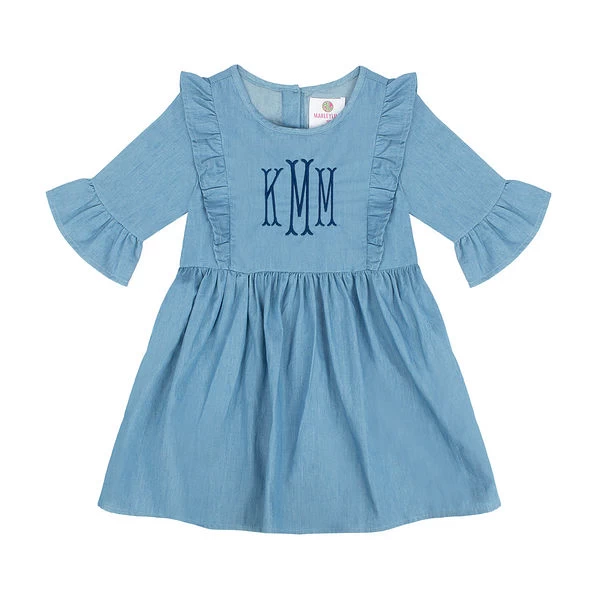 We think that this Monogrammed Kids’ Ruffle Denim Dress is seriously the cutest thing we’ve ever seen! It features three-quarter bell sleeves that are accented with sweet ruffles, along with a charming ruffled bib. Buttons on the back make for easy-on, easy-off dressing. It’s available in multiple sizes, too — from infant sizes to YXL. Personalize this infant, girl and toddler denim chambray dress with a monogram that you love, whether it’s our suggested Fishtail monogram font or another awesome choice of your own. You can even choose your embroidery color, too! Use our preview tool to see the end result. Prefer a non-personalized look? Just check the “Do Not Personalize” box to let us know.