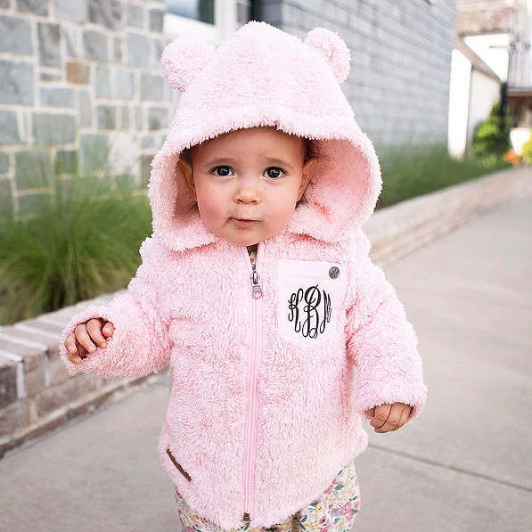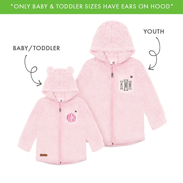Stay cozy and warm on chilly days with our Monogrammed Kids’ Sherpa Hoodies. Baby, toddler, and kids’ sizes are available at Marleylilly Kids. Made with cozy Sherpa-style material, this super-soft Sherpa hoodie in baby, toddler, and youth sizes is likely to become their new favorite cool-weather wardrobe essential.
