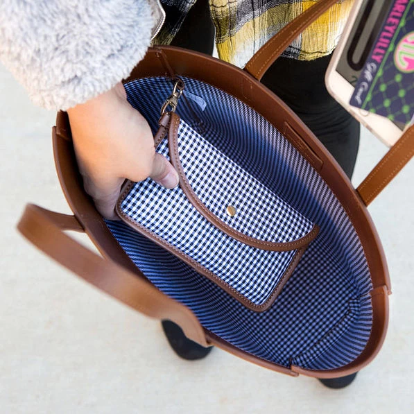 The perfect everyday tote is here! This Genuine Leather Tote Bag features a rich brown leather, a black and white gingham lining, and a gold foil monogram on the front of the bag. This bag makes the perfect monogrammed gift and is great for toting around all of your essentials. This leather tote also comes with a black and white gingham and leather trimmed pouch that attaches to the inside of the bag. Grab your monogrammed keychain and monogrammed wallet and you’re ready to go!