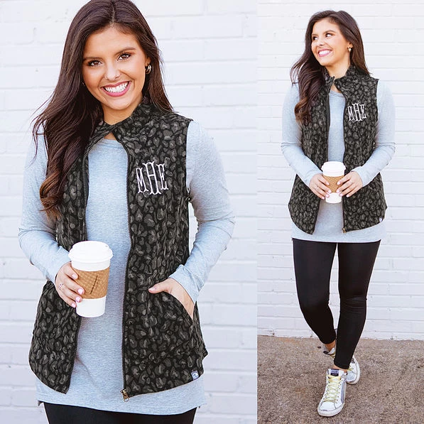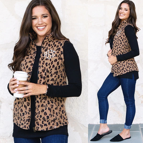 Our Monogrammed Leopard Fleece Vest is perfect for chilly fall mornings at the soccer or football fields. It’s also great for date nights with your favorite guy or gal, happy hours with friends and Sunday brunches with family. This versatile leopard print vest is a great add to just about any outfit; this leopard-print fleece fall item can be dressed up or dressed down. Consider pairing this animal print vest with our Monogrammed Button Down Tunic or our monogrammed Pullover Boyfriend Tunic Top. What’s even better? Our Monogrammed Leopard Fleece Vest is available in multiple sizes, including Monogrammed Kids Leopard Print Fleece, for an adorable Mommy and Me look!