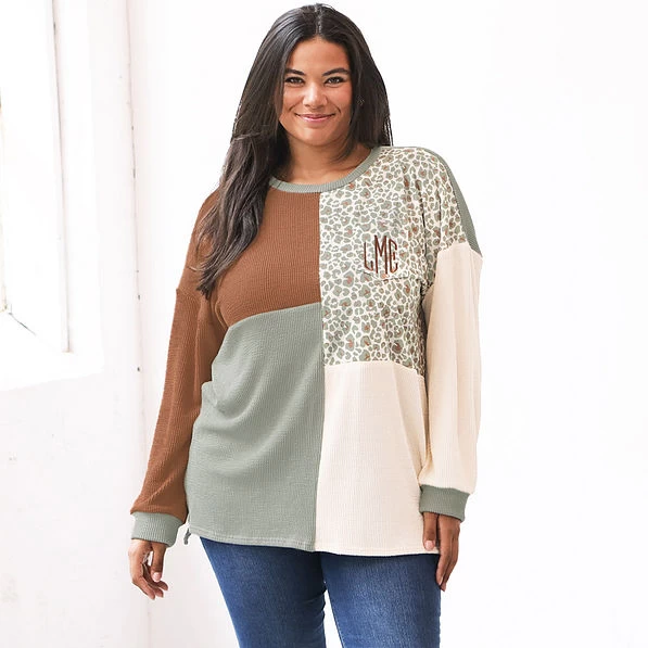 Embrace your wild side while staying cozy this season! Our Monogrammed Leopard Sweatshirt features a colorblock pattern and the monogram of your choice on the front chest pocket. Our super-comfy leopard sweatshirt is a comfortable tunic length and has a finished side slit, which makes it perfect to pair with leggings and — of course — your Marleylilly monogrammed duck boots!