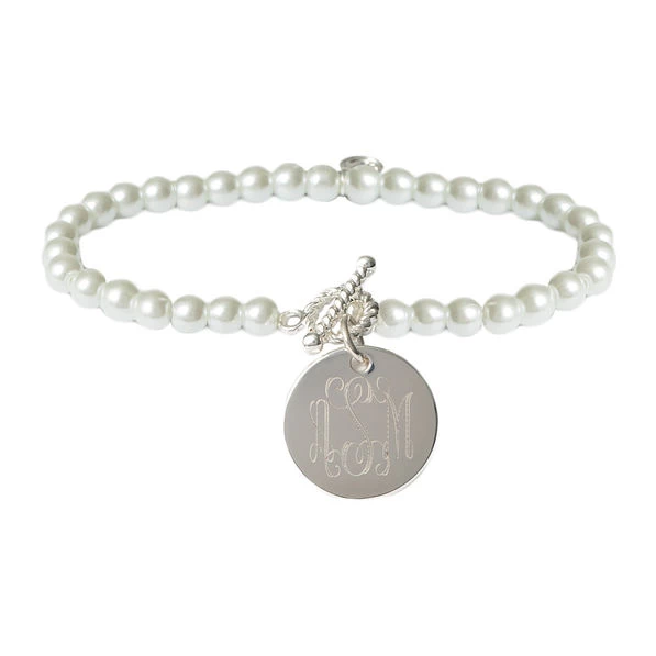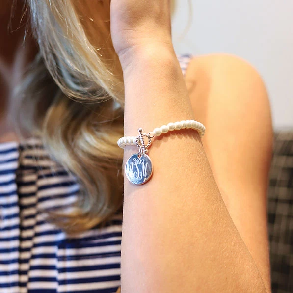 Looking for a sweet and classic bracelet to give a special woman in your life? This Monogrammed Pearl Bracelet with a 7/8 inch charm and faux pearl beads is the perfect piece to make her feel special. Personalize it with her initials in the font of your choice. This bracelet has a stretchy fit so that it can fit almost any wrist. It is made of faux pearls and a metal alloy. Check out our monogrammed earrings and monogrammed necklaces for other great gift ideas!