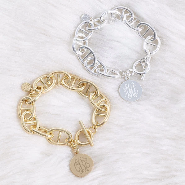 You’re going to love this engraved disc bracelet from Marleylilly — available in gold or silver. Perfect for dressing up your look or adding to your stack, this bracelet features your monogram engraved on a 17mm disc. Perfect for any look, this plated brass bracelet measures approximately 7.5 inches long and would look great paired with a monogrammed bracelet and earrings! Personalize one to add to your jewelry box today!