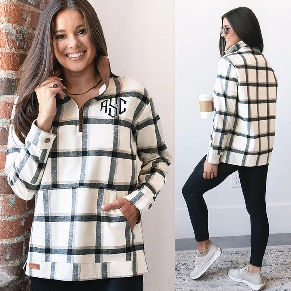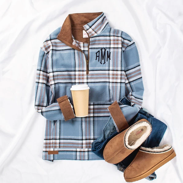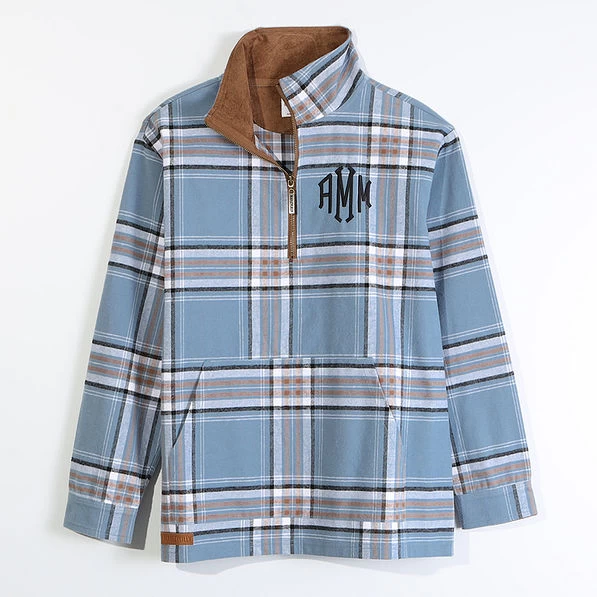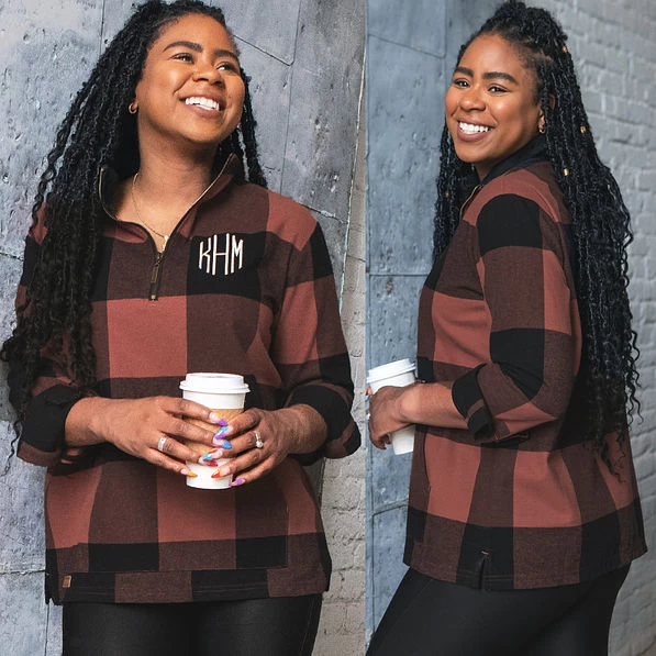 Our Monogrammed Plaid Pullover is ideal for fall and cold weather layering! With its woven texture and warm ¾-zip style, this is one must-have pullover that’s an essential for your wardrobe.