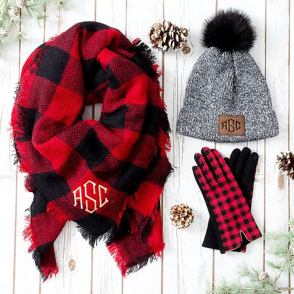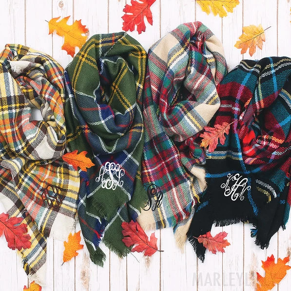 Love blanket scarves and monograms?! Then you will love these plaid scarves personalized with your monogram! These monogrammed scarves come in four different stylish plaid patterns and are made of acrylic. These cute scarves are perfect personalized gifts for any special woman in your life! Personalize yours to go with your monogrammed boots and monogrammed jewelry!