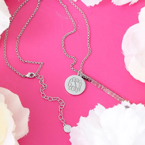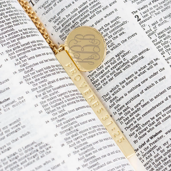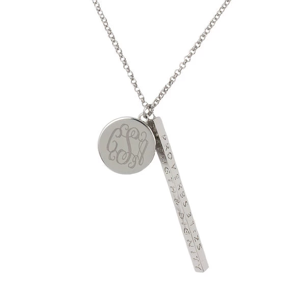 Celebrate the joy of womanhood with a Monogrammed Proverbs 31:25 Necklace from Marleylilly! Proverbs 31:25 reads: “She is clothed with strength and dignity, and she laughs without fear of the future” (NLT) — a favorite verse of women everywhere. This Christian scripture necklace features two charms that are available in either a gold or silver finish. The classic disc charm is engraved with the monogram of your choice; the prism-style bar charm has a “Proverbs 31:25” imprint, along with “Strength & Dignity” text.