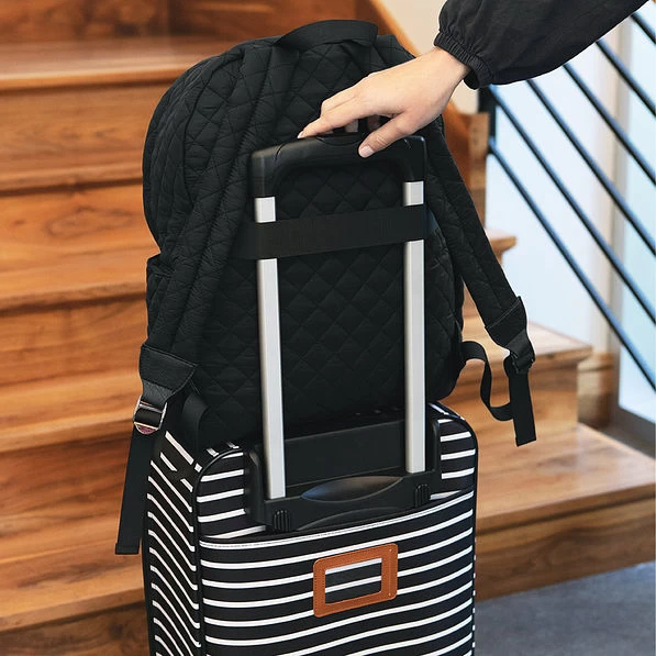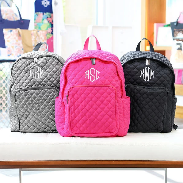 Keep up with all of your essentials with this spacious and trendy Monogrammed Diamond Quilted Laptop Backpack! Whether you are running across campus or to your local coffee shop you will have everything you need in this backpack. Includes a luggage strap on back for sliding over a suitcase handle to ease your load when traveling!