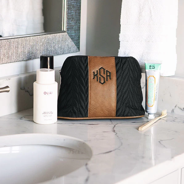 Keep your makeup, cosmetic brushes and accessories secure while traveling with our Personalized Quilted Cosmetic Case. This zip-top personalized cosmetic bag is roomy enough for all of your essentials — and then some! It can also easily be paired with our fab matching counterpart, the monogrammed quilted train case.
