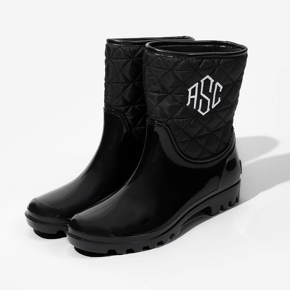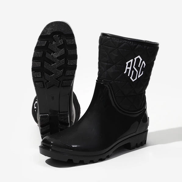 Introducing our stylish monogrammed quilted rain boots, a perfect combination of fashion and functionality. These boots feature a trendy quilted shaft, adding a touch of sophistication to your rainy day ensemble. The quilted design not only offers an eye-catching appeal but also provides added insulation and comfort.