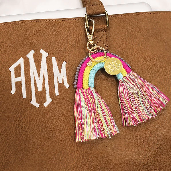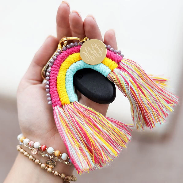 Keep up with your keys in the cutest way with this personalized rainbow keychain! This keychain features a round gold pendant for your monogram measuring about 25mm in diameter, lobster claw clamp, and multi-color thread wrapped rainbow keychain. The rainbow keychain features a combination of hot pink, yellow, and baby blue threads and lilac beads. Shop more monogrammed keychains here.