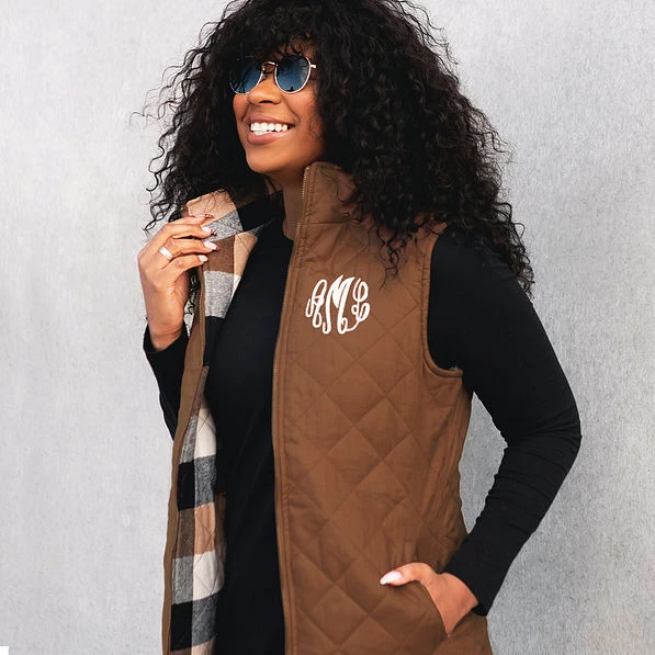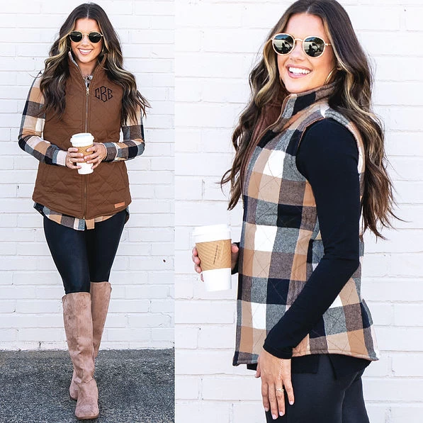 This monogrammed reversible vest is a must have for your fall wardrobe! This vest is truly two vests in one; the oatmeal vest has an opposite pumpkin plaid side and the black vest has an opposite buffalo plaid side, and the hickory vest has an opposite caramel and black buffalo plaid side. You will definitely enjoy the versatility of this vest as you style it multiple ways. Also, it has pockets! Dress it up by styling it over a dress with a pair of over the knee boots or dress it down by styling with a pair of leggings and duck boots!