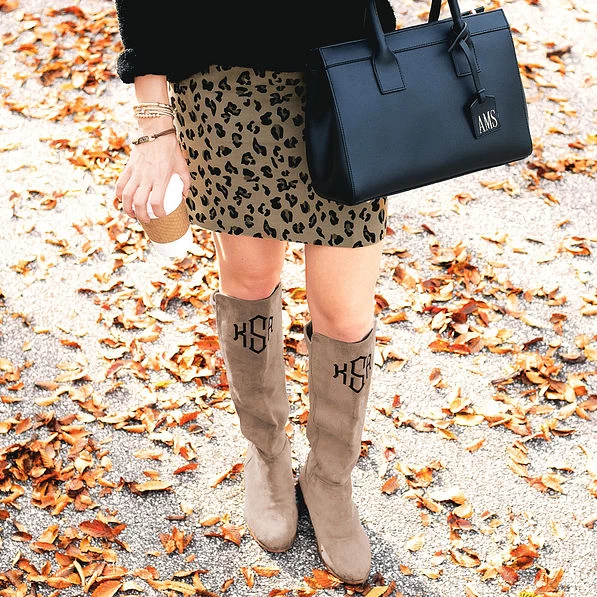 Get ready for fall with oversized sweaters, comfy leggings, cozy scarves and monogrammed boots! Each riding boot is embroidered at the top center with the initials, font and thread color of your choice for a great personal touch. To ensure each boot is easy to pull on and take off, the back panel is stretchy. Featuring a faux suede tan color, these monogrammed boots are perfect for matching any outfit.