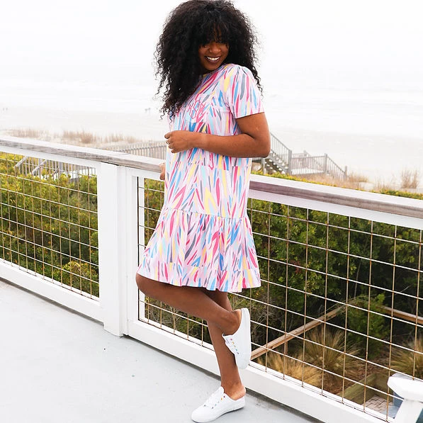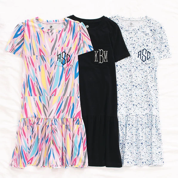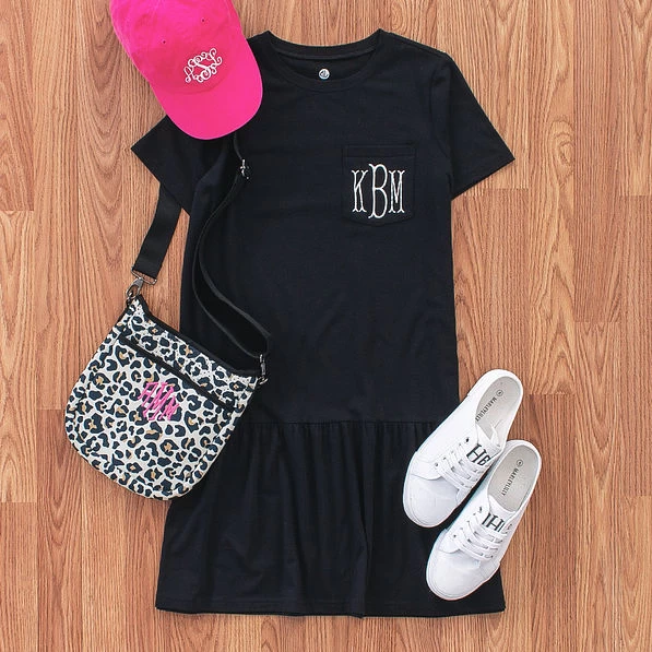 Our monogrammed ruffle dress is perfect for a throw-on-and-go look that is as effortless as it is comfortable. This short sleeve dress features a stylish crew neck and a swing silhouette. This monogrammed dress is made from a durable tri-blend of cotton, polyester and spandex, so it will wash and wear beautifully throughout many seasons. Add your favorite denim jacket or sweater and grab your go-to Marleylilly crossbody bag: you’re all set for a comfy day of work, shopping or errands.