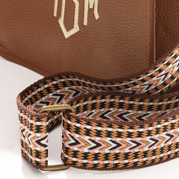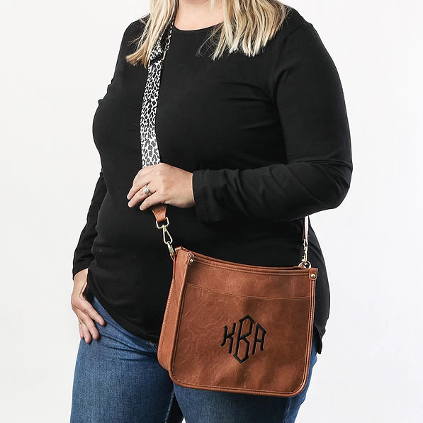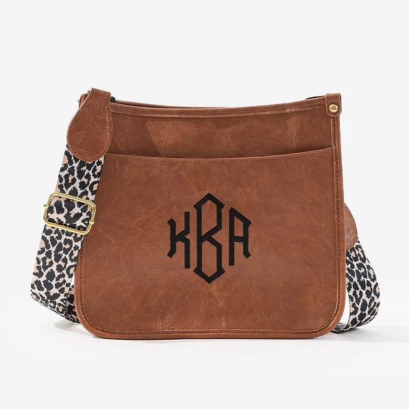 Carry your essentials in style with this cute crossbody! With antiqued gold hardware and an adjustable printed strap, this monogrammed crossbody will go perfect with any outfit.