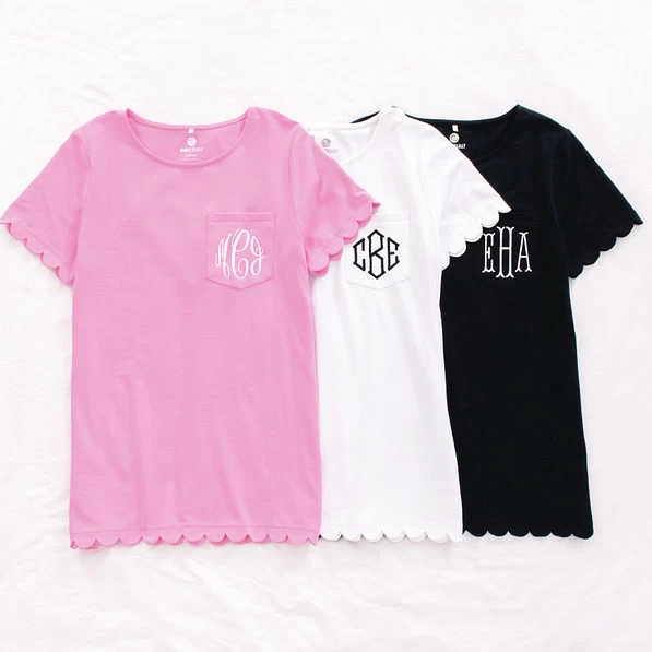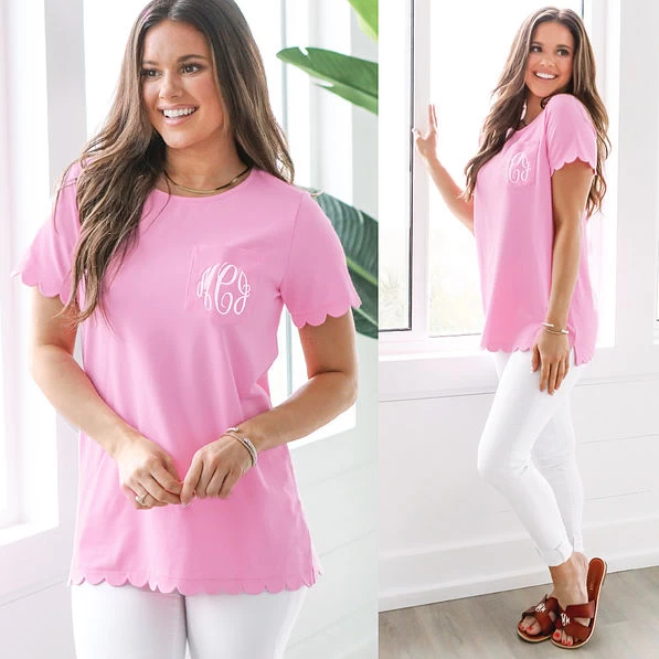 Enjoy your lazy summer days sipping lemonade and enjoying the company of friends and family on a wrap-around front porch. These days are guaranteed to be cool, comfortable and casual in our personalized scalloped top from Marleylilly. Available in carnation pink, white, and black, these monogrammed tees are guaranteed to be your go-to for summer style. Add your favorite jeans, your go-to monogrammed sandals and a must-have monogrammed bag for a custom monogram style that is unlike any others.