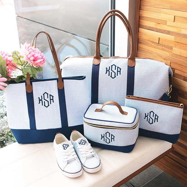 Our current obsession? This Monogrammed Seersucker Cosmetic Bag! If you’re looking to buy a gift for your friend, mom, or bridesmaids – this personalized bag would be absolutely perfect! As soon as you pick up this case, you can totally feel that it was constructed with high quality materials and made for durability. This cosmetic bag is fairly large with plenty of room to stash all of your makeup and knick-knacks! Pair this bag with our monogrammed seersucker weekender to create that perfect high class, travel look!