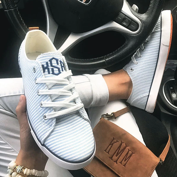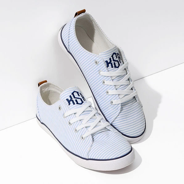 These seersucker monogrammed sneakers allow you to put your personalized stamp on them with your choice of monogram color and script style. These shoes are perfect for the spring season and go well with any spring outfit. Our canvas personalized lace-up seersucker sneakers are a casual, comfortable, and fashionable addition to any outfit.