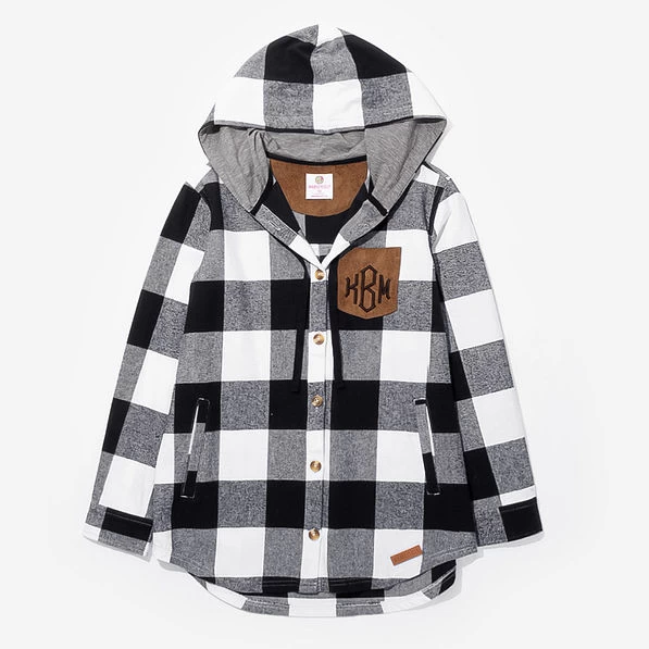 This monogrammed shirt jacket is so comfortable, you’ll want to live in it! Available in a variety of prints, this top is the perfect transitional piece from summer to fall. This jacket features an oversized fit, a button front, hood, and monogrammed faux-pocket chest pocket for an ultra-custom look.