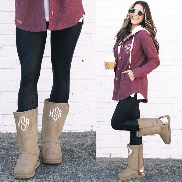 Add your favorite leggings or tuck the hems of your skinny jeans into these Sherpa boots for an eye-catching look that is always in style. Add some other winter weather apparel with our monogrammed vests, monogrammed outerwear and monogrammed hats.